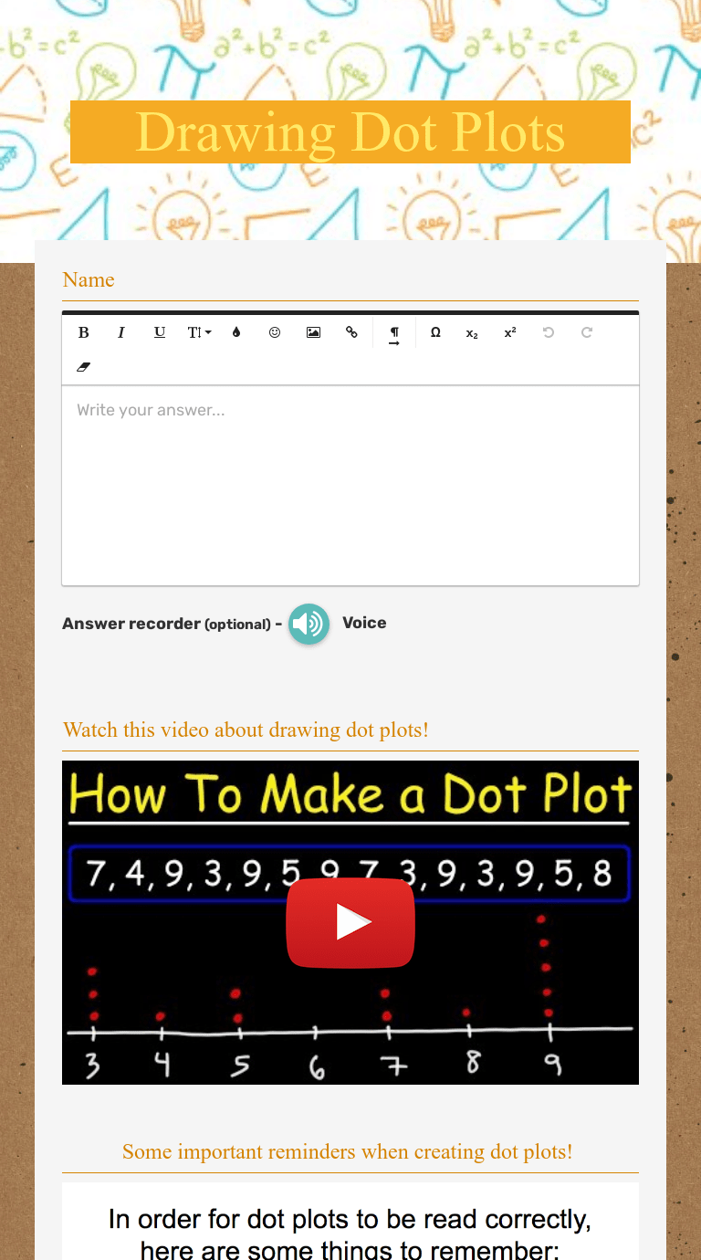 Dot Plots Worksheet / Dot Plot Worksheet By Tina S Room Teachers Pay Teachers /. In a dot plot a cluster shows where a group of data points fall. Use the data below to construct a dot plot and box plot. The dot plot here shows. The students in one social studies class were asked how many brothers and sisters (siblings) they each have. Students get experience interpreting data from dot plots as well as using .